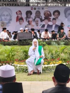 “Sehelai rumput yang kering, sebutir pasir Indonesia adalah kehormatan tanah air. Setuju?” seru Ketua Majelis Sufi Dunia itu disambut pekik takbir hadirin.