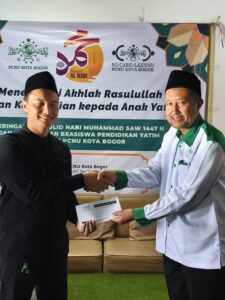 Penyerahan bantuan secara simbolis dilakukan oleh Ketua Lazisnu PCNU Kota Bogor, Ir. Abdul Aziz Mukhlis M.H., kepada Ketua Yayasan Almaarif Aswaja Annahdlah Indonesia (Mawani), Faridh Almuhayat Uhib H.